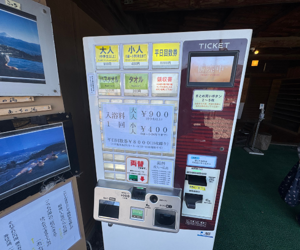 券売機で、入浴料金900円の支払い(タオルは別途料金200円が掛かります)